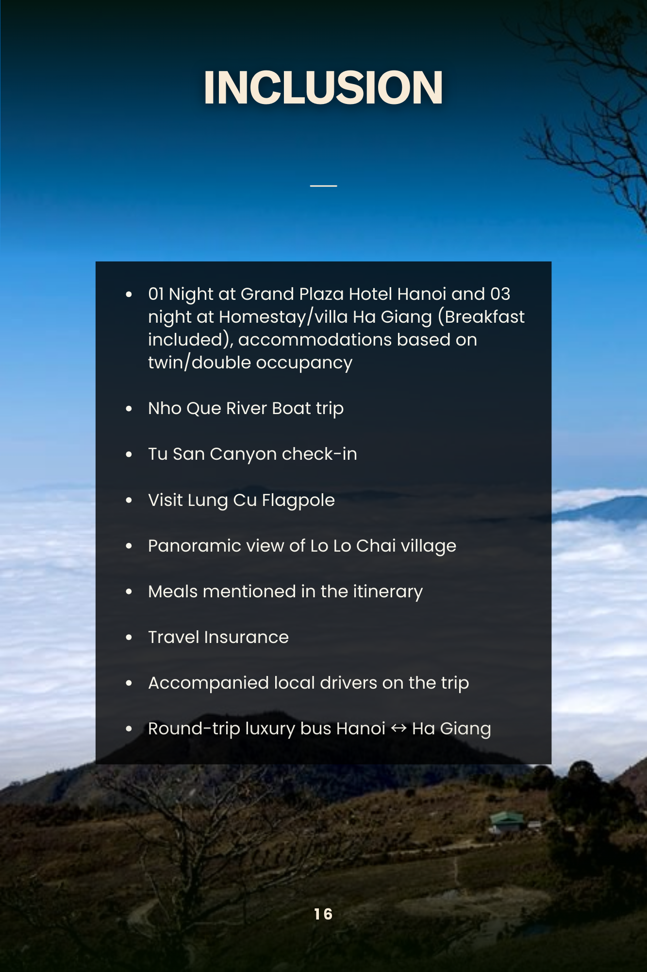 - 1 night at Grand Plaza Hotel Hanoi and 3 nights at homestay/resort in Ha Giang.